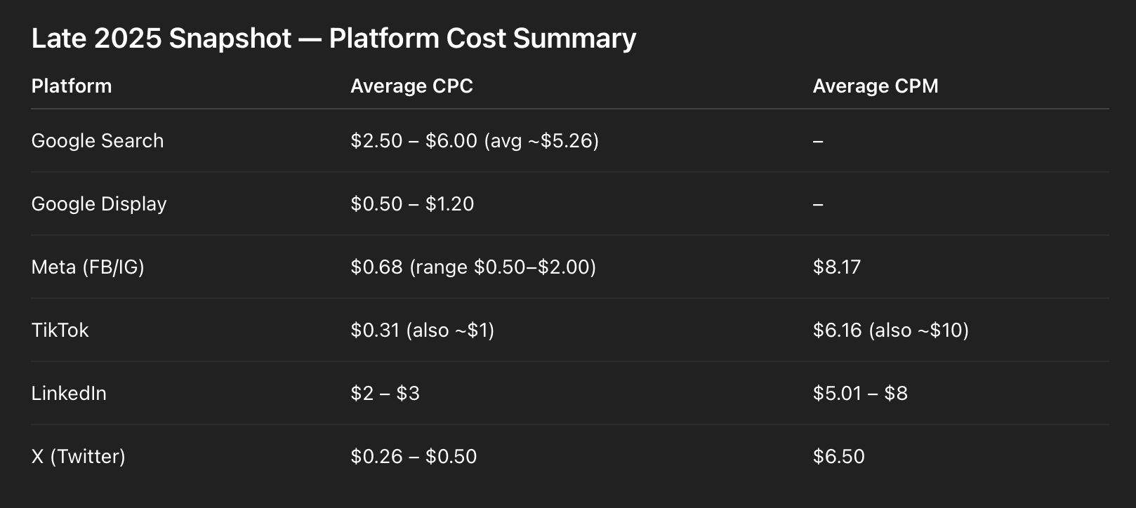 Search CPC: Ranges from $2.50 to $6.00, varying by industry and targeting.